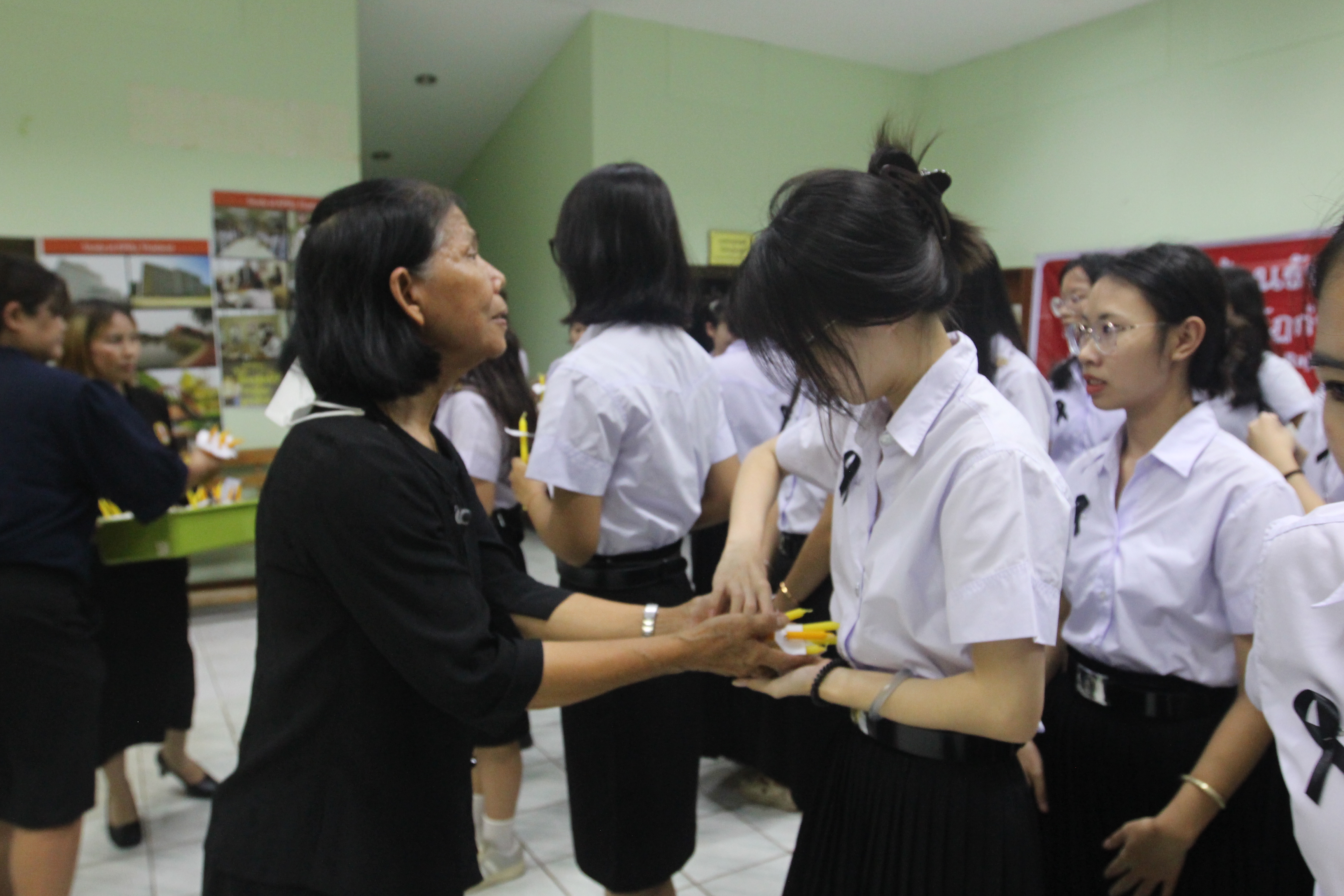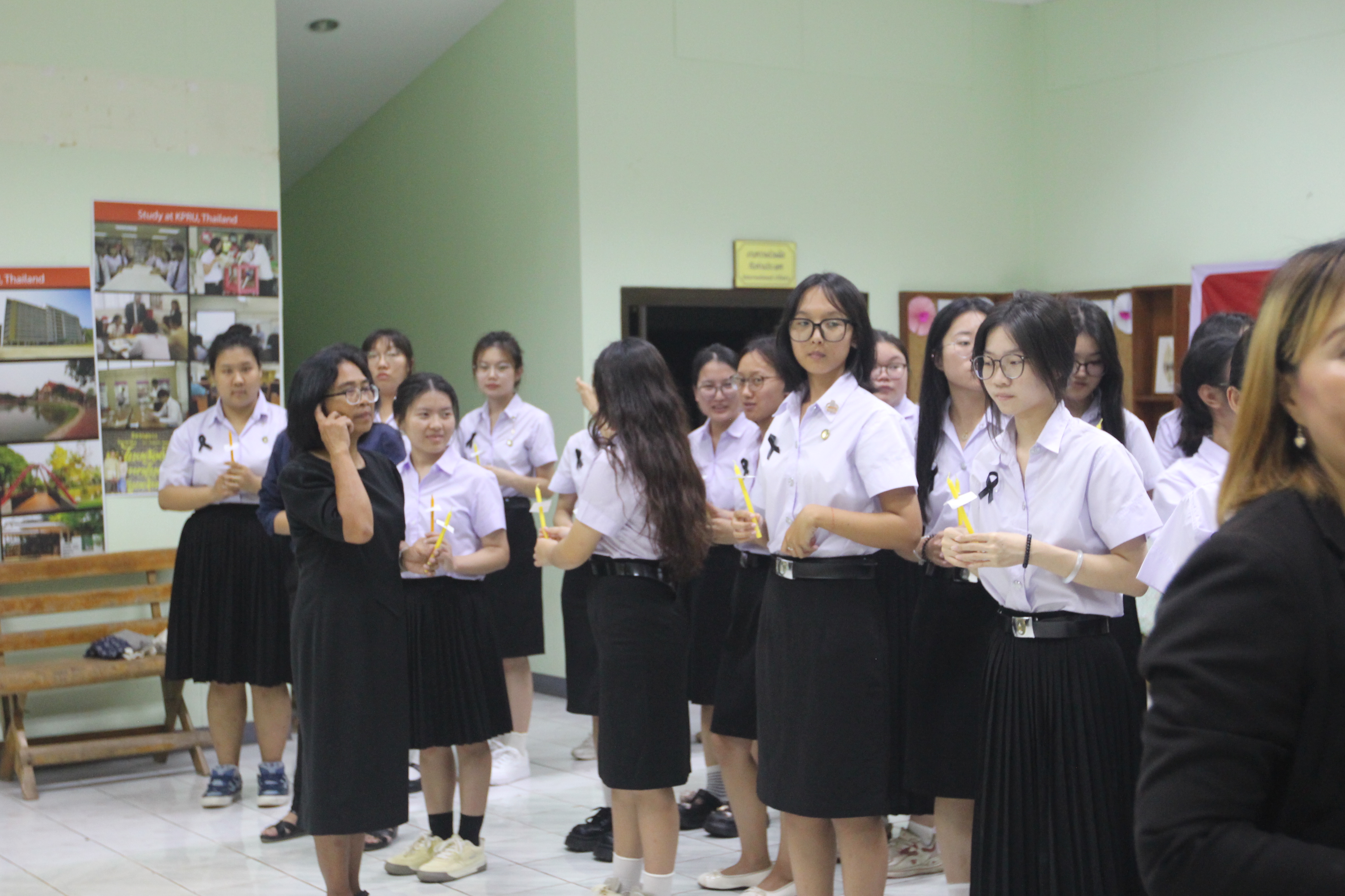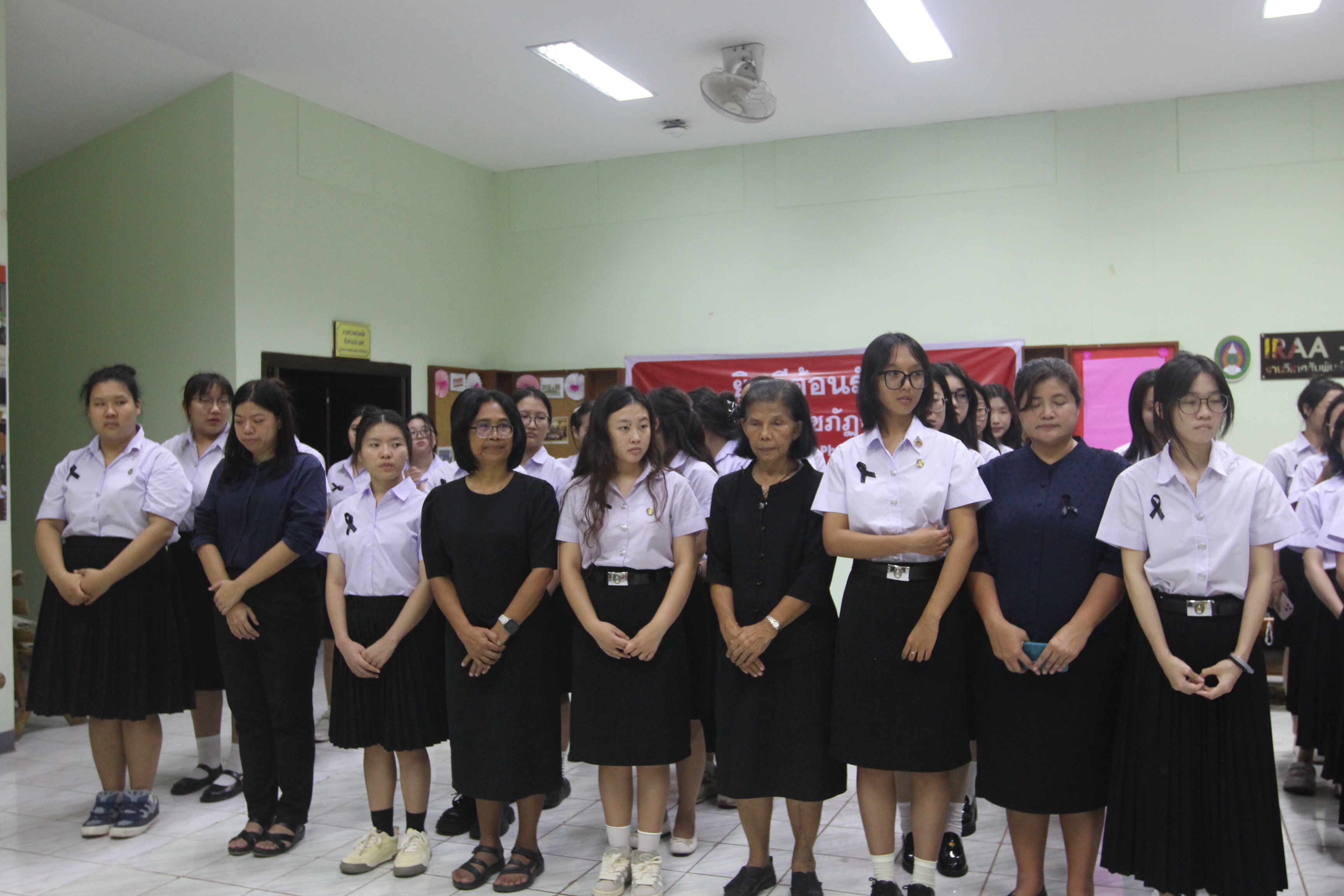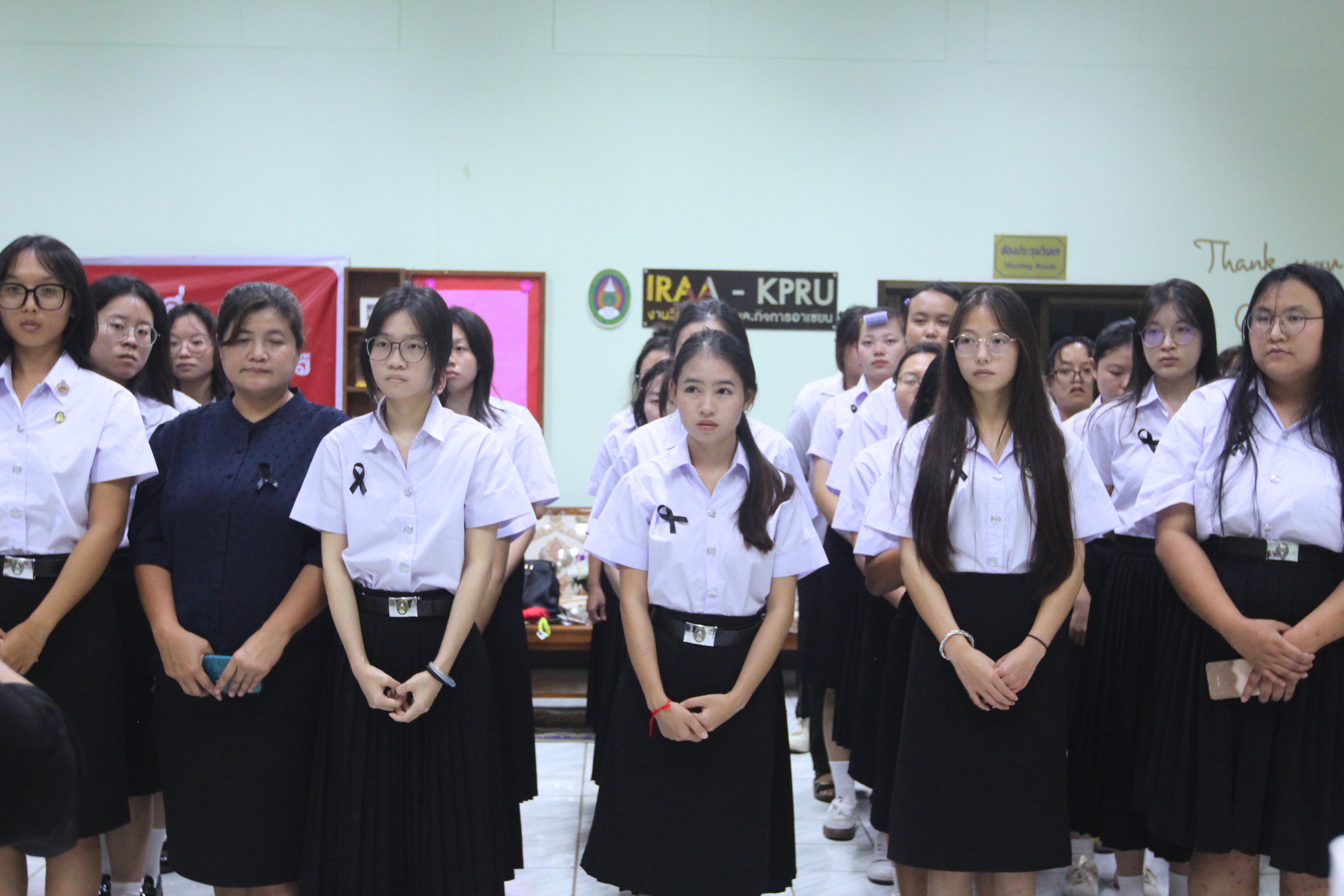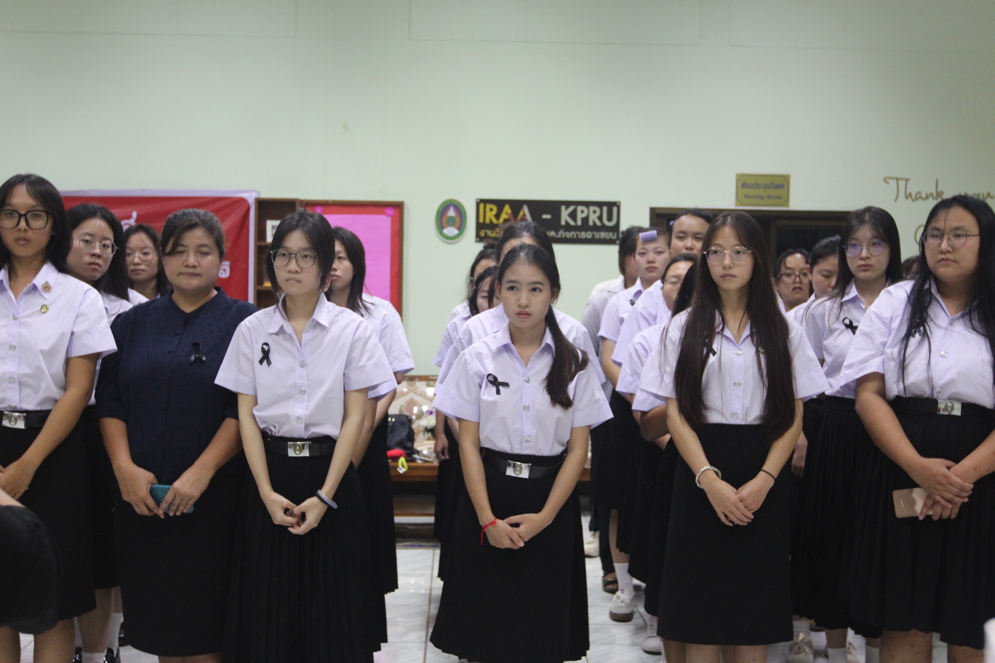 ในการนี้ รองศาสตราจารย์ ดร.สุนทรี ดวงทิพย์ อาจารย์โปรแกรมวิชาภาษาไทย ได้กล่าวถึงประวัติโดยย่อของสมเด็จพระนางเจ้าสิริกิติ์ พระบรมราชินีนาถ พระบรมราชชนนีพันปีหลวง ให้นักศึกษาต่างชาติทราบโดยสังเขป จากนั้น ผู้เข้าร่วมกิจกรรมได้ร่วมกันสงบนิ่งเพื่อไว้อาลัยแด่สมเด็จพระนางเจ้าสิริกิตต์ พระบรมราชินีนาถ พระบรมราชชนนีพันปีหลวง เป็นเวลา 93 วินาที ต่อจากนั้น รองศาสตราจารย์ ดร.สุนทรี ดวงทิพย์ ได้นำกล่าวถวายความจงรักภักดีและจุดเทียนน้อมรำลึกในพระมหากรุณาธิคุณที่พระองค์ท่านทรงเป็นแบบอย่างของพสกนิกรทั้งชาวไทยและชาวต่างชาติที่เข้ามาอาศัยอยู่ในราชอาณาจักรไทย ที่สำคัญ พระองค์ยังทรงทุ่มเทพระวรกายในการปฏิบัติพระราชกรณียกิจต่างๆ อย่างมากมาย เพื่อให้ประชาชนมีความสุข มีความเป็นอยู่ที่ดี และมีอาชีพที่สามารถเลี้ยงตนเองได้อย่างพอเพียง โดยเฉพาะโครงการศูนย์ศิลปาชีพ และโครงการบ้านเล็กในป่าใหญ่ ซึ่งประชาชนจังหวัดกำแพงเพชรถือเป็นหนึ่งในกลุ่มพสกนิกรชาวไทยที่ได้รับพระเมตตาจากพระองค์ท่านในการรับประชาชนชาวไทยภูเขาในพื้นที่อำเภอคลองลานเป็นสมาชิกศูนย์ศิลปาชีพผ่านการปักผ้าลวดลายต่างๆ ซึ่งได้โอบอุ้ม ช่วยเหลือชาวนาชาวไร่ในท้องถิ่นห่างไกลให้มีชีวิตที่ดีขึ้น สามารถส่งลูกหลานได้เรียนหนังสือและครอบครัวมีชีวิตที่ดี เป็นการขยายโอกาสและเพิ่มคุณภาพชีวิตให้แก่ราษฎร โดยพระองค์เคยกล่าวไว้ว่า