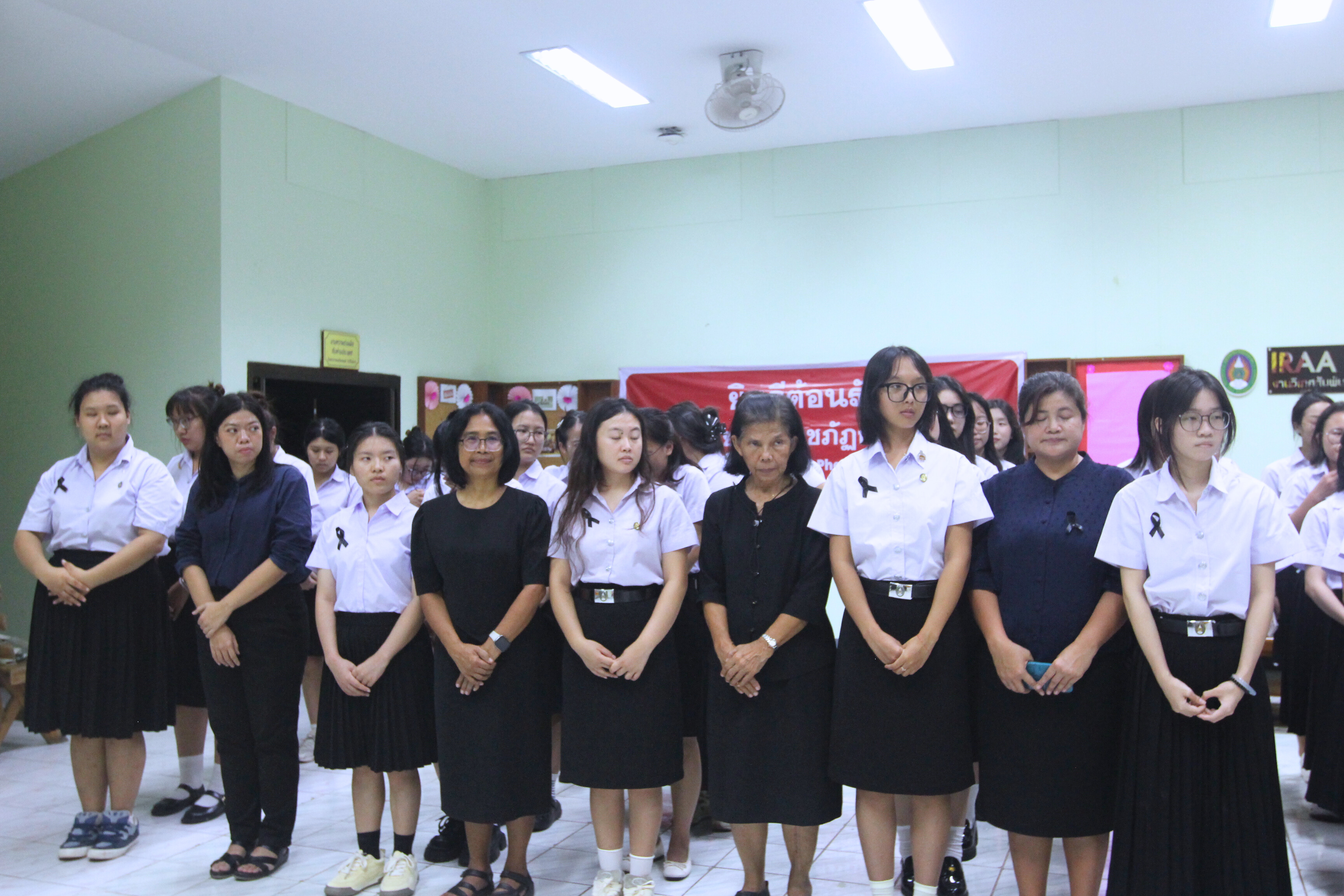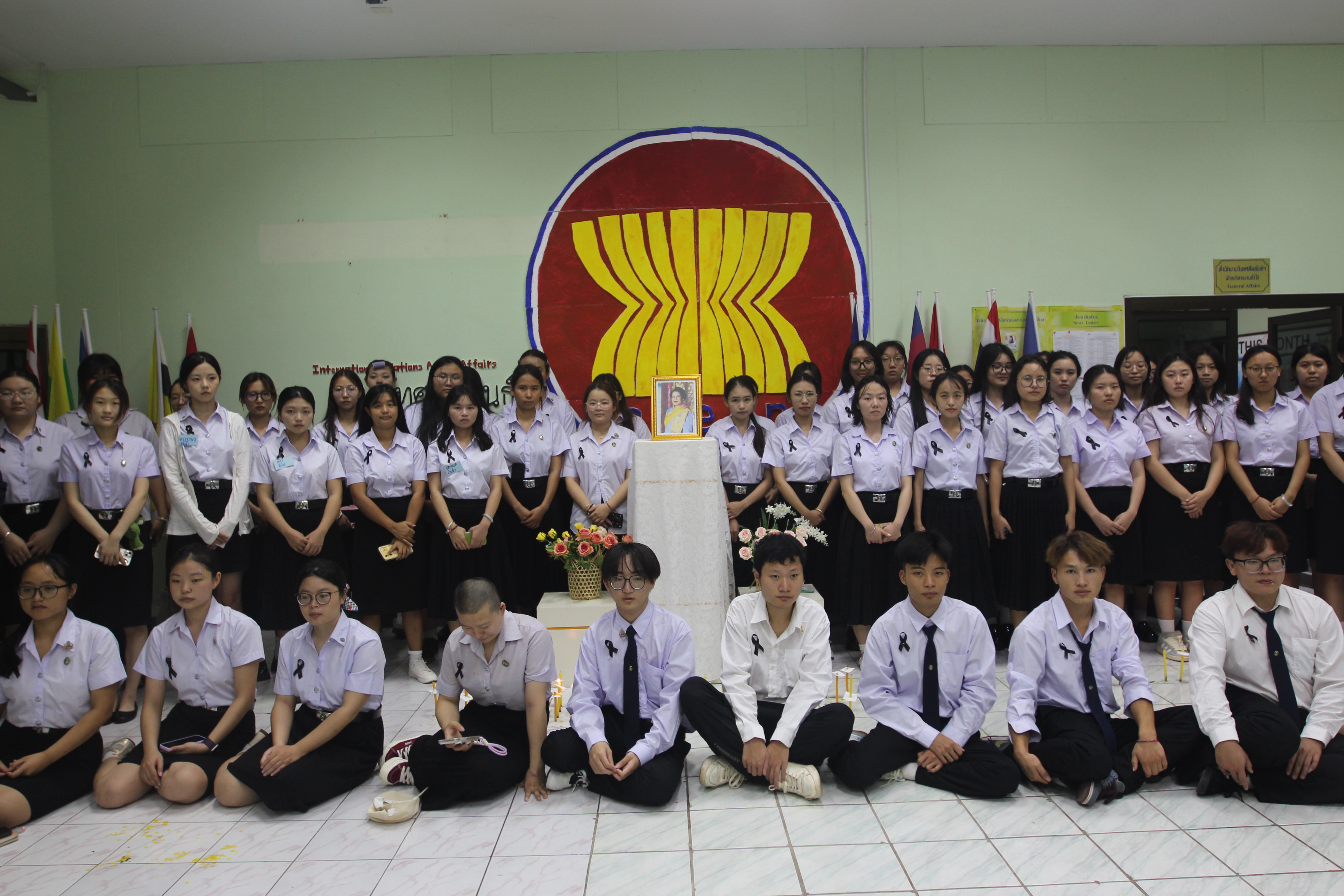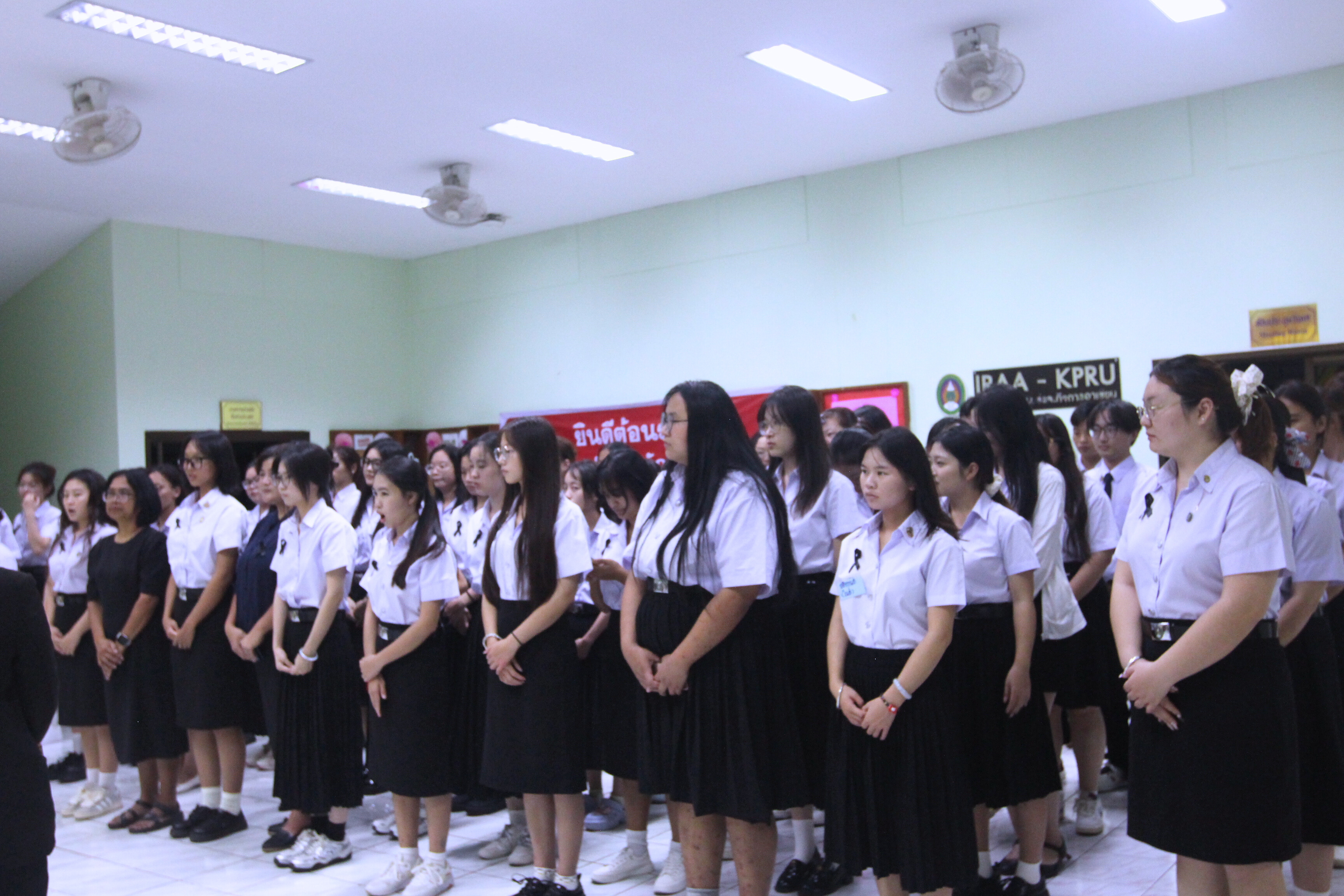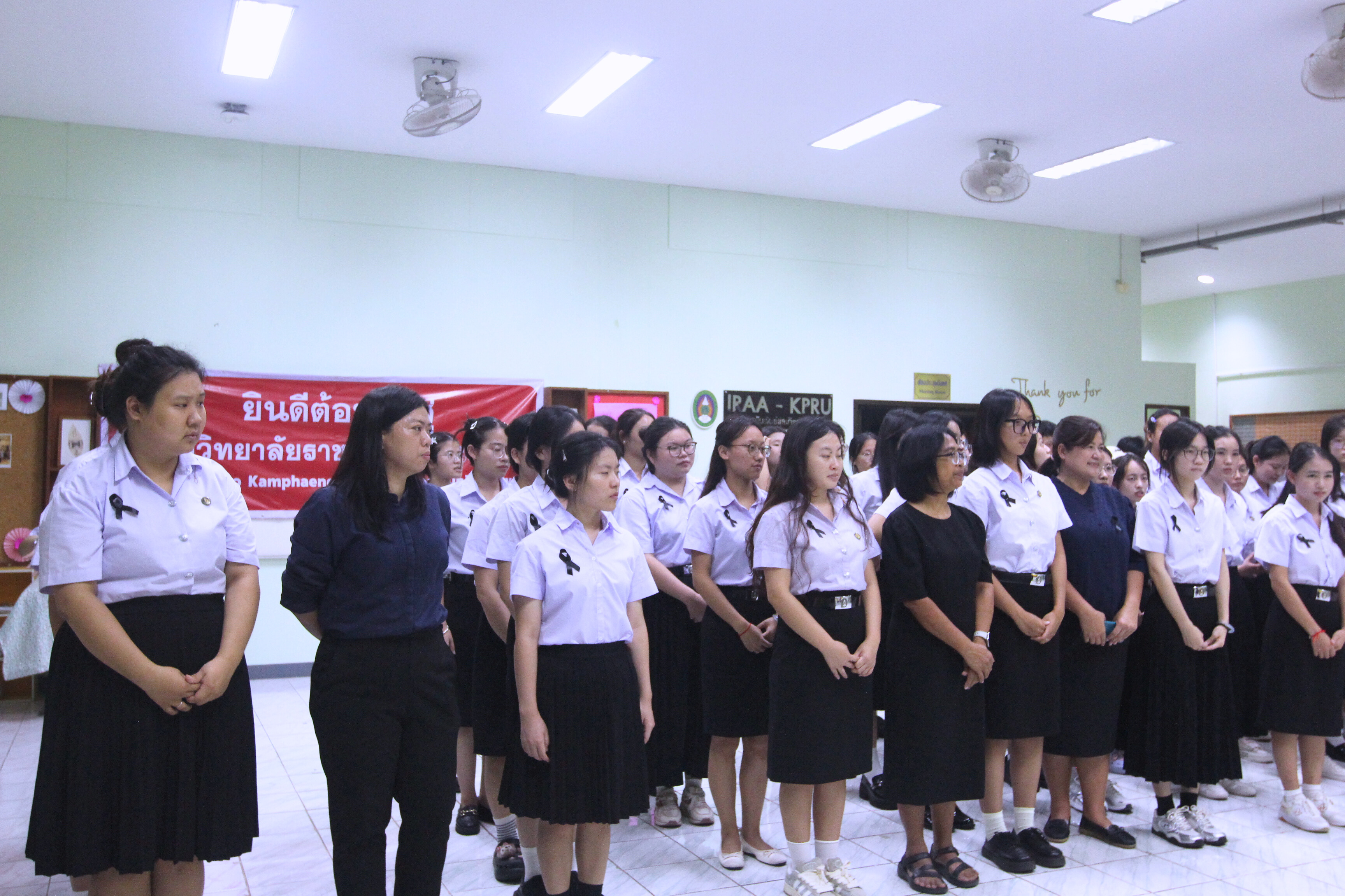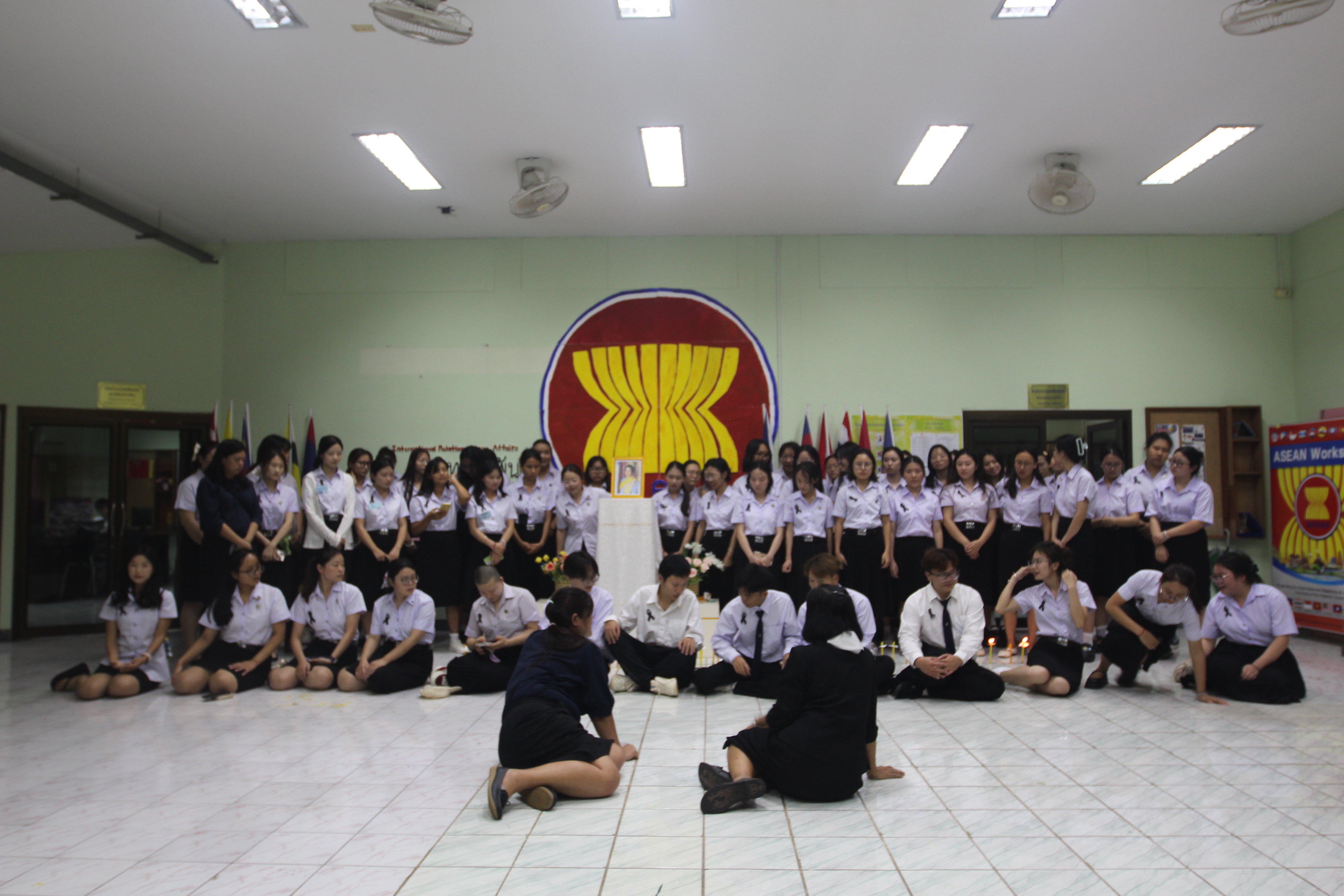 ในการนี้ รองศาสตราจารย์ ดร.สุนทรี ดวงทิพย์ อาจารย์โปรแกรมวิชาภาษาไทย ได้กล่าวถึงประวัติโดยย่อของสมเด็จพระนางเจ้าสิริกิติ์ พระบรมราชินีนาถ พระบรมราชชนนีพันปีหลวง ให้นักศึกษาต่างชาติทราบโดยสังเขป จากนั้น ผู้เข้าร่วมกิจกรรมได้ร่วมกันสงบนิ่งเพื่อไว้อาลัยแด่สมเด็จพระนางเจ้าสิริกิตต์ พระบรมราชินีนาถ พระบรมราชชนนีพันปีหลวง เป็นเวลา 93 วินาที ต่อจากนั้น รองศาสตราจารย์ ดร.สุนทรี ดวงทิพย์ ได้นำกล่าวถวายความจงรักภักดีและจุดเทียนน้อมรำลึกในพระมหากรุณาธิคุณที่พระองค์ท่านทรงเป็นแบบอย่างของพสกนิกรทั้งชาวไทยและชาวต่างชาติที่เข้ามาอาศัยอยู่ในราชอาณาจักรไทย ที่สำคัญ พระองค์ยังทรงทุ่มเทพระวรกายในการปฏิบัติพระราชกรณียกิจต่างๆ อย่างมากมาย เพื่อให้ประชาชนมีความสุข มีความเป็นอยู่ที่ดี และมีอาชีพที่สามารถเลี้ยงตนเองได้อย่างพอเพียง โดยเฉพาะโครงการศูนย์ศิลปาชีพ และโครงการบ้านเล็กในป่าใหญ่ ซึ่งประชาชนจังหวัดกำแพงเพชรถือเป็นหนึ่งในกลุ่มพสกนิกรชาวไทยที่ได้รับพระเมตตาจากพระองค์ท่านในการรับประชาชนชาวไทยภูเขาในพื้นที่อำเภอคลองลานเป็นสมาชิกศูนย์ศิลปาชีพผ่านการปักผ้าลวดลายต่างๆ ซึ่งได้โอบอุ้ม ช่วยเหลือชาวนาชาวไร่ในท้องถิ่นห่างไกลให้มีชีวิตที่ดีขึ้น สามารถส่งลูกหลานได้เรียนหนังสือและครอบครัวมีชีวิตที่ดี เป็นการขยายโอกาสและเพิ่มคุณภาพชีวิตให้แก่ราษฎร โดยพระองค์เคยกล่าวไว้ว่า