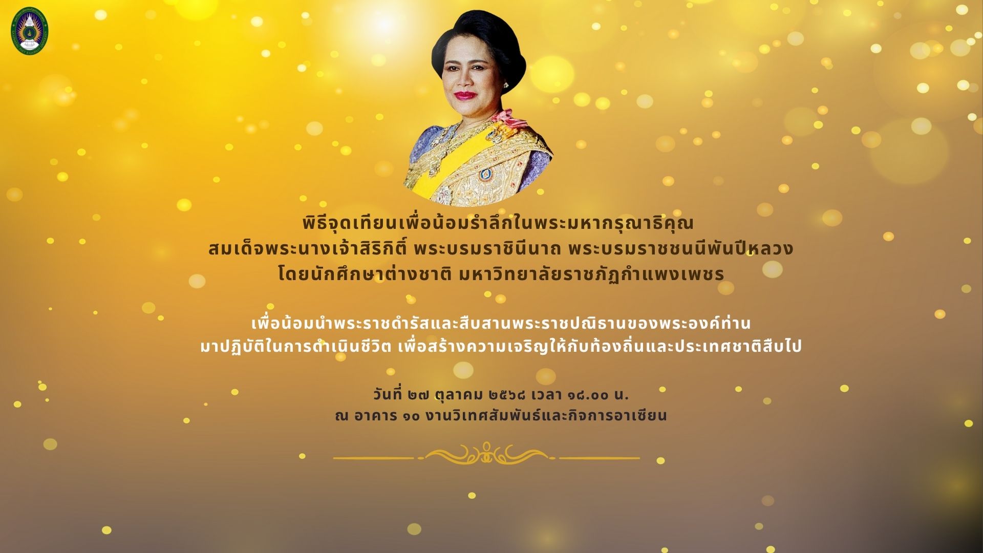 สำหรับมหาวิทยาลัยราชภัฏกำแพงเพชร ภายใต้การนำของผู้ช่วยศาสตราจารย์ ดร. ปรียานุช พรหมภาสิต อธิการบดีและผู้บริหารทุกท่าน ได้เน้นย้ำภารกิจในการเป็นสถาบันการศึกษาเพื่อการพัฒนาท้องถิ่น และสร้างความเป็นนานาชาติให้เป็นที่ยอมรับในระดับสากล โดยมหาวิทยาลัยฯ ได้มีการจัดการเรียนการสอนสำหรับนักศึกษาต่างชาติ ในหลักสูตรปริญญาตรี ภาคปกติ โปรแกรมวิชาภาษาไทย คณะมนุษยศาสตร์และสังคมศาสตร์ ซึ่งมีการเรียนในรายวิชาประวัติศาสตร์ไทย สังคมและวัฒนธรรมไทย ซึ่งการจัดพิธีจุดเทียนน้อมรำลึกในพระมหากรุณาธิคุณ สมเด็จพระนางเจ้าสิริกิติ์ พระบรมราชินีนาถ พระบรมราชชนนีพันปีหลวง ในวันนี้ ถือเป็นหนึ่งในกิจกรรมที่จะสร้างความรู้ความเข้าใจ และการเรียนรู้ประวัติศาสตร์ไทยโดยตรง ที่สำคัญ นักศึกษาต่างชาติยังได้มีส่วนร่วมในการแสดงความจงรักภักดีในฐานะบัณฑิตของพระราชาได้อย่างเต็มภาคภูมิและซาบซึ้งในพระมหากรุณาธิคุณของ “พระแม่แห่งแผ่นดินไทย” เพื่อจะได้น้อมนำพระราชดำรัสและสืบสานพระราชปณิธานของพระองค์ท่านมาปฏิบัติในการดำเนินชีวิต เพื่อสร้างความเจริญให้กับท้องถิ่นและประเทศชาติตามพันธกิจของมหาวิทยาลัยราชภัฏต่อไป