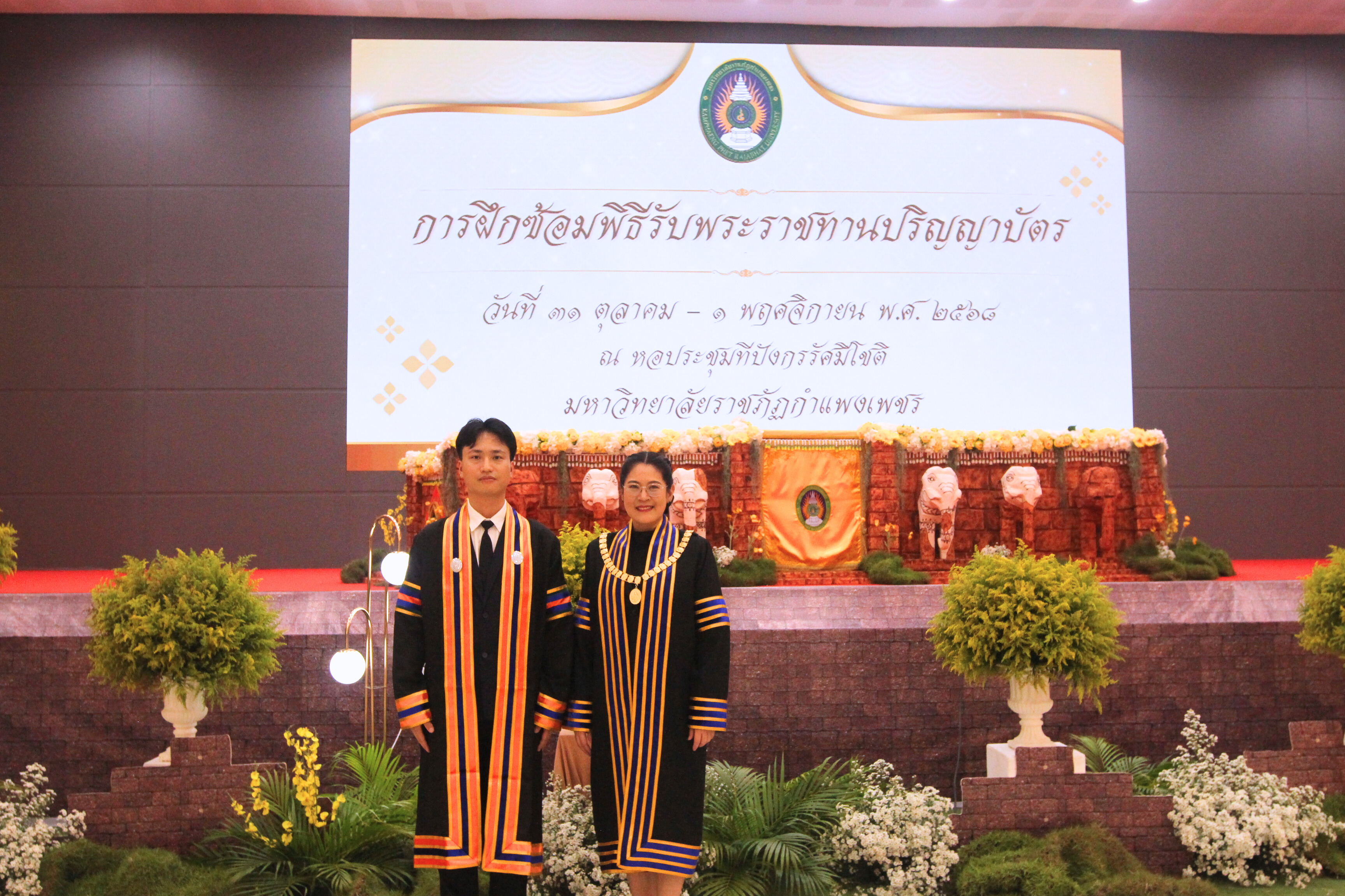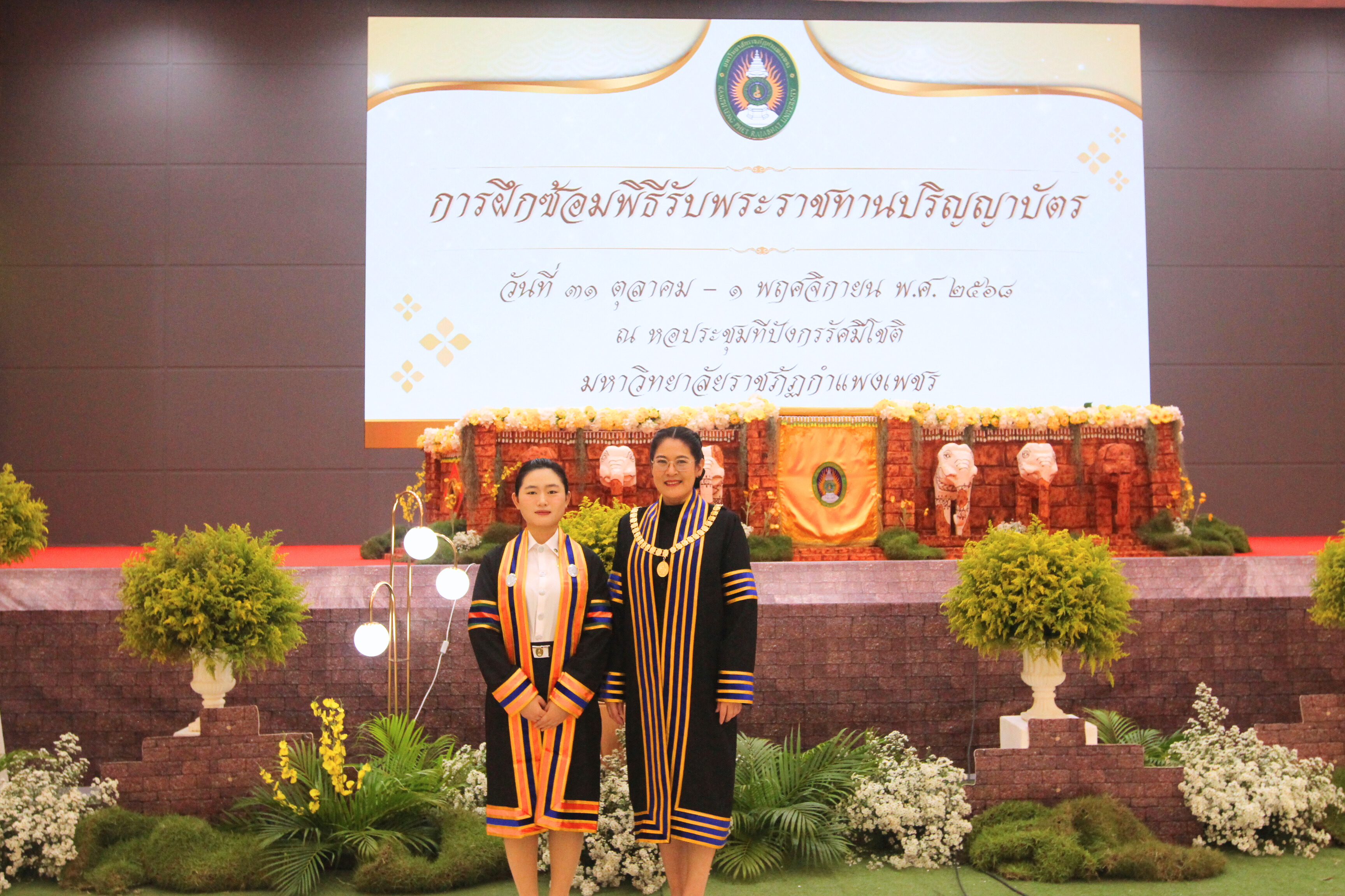 ผู้ช่วยศาสตราจารย์ ดร.ปรียานุช พรหมภาสิต อธิการบดีมหาวิทยาลัยราชภัฏกำแพงเพชร ถ่ายภาพแสดงความยินดีกับบัณฑิตตต่างชาติ ที่เข้ารับพระราชทานปริญญาบัตร ประจำปี 2568